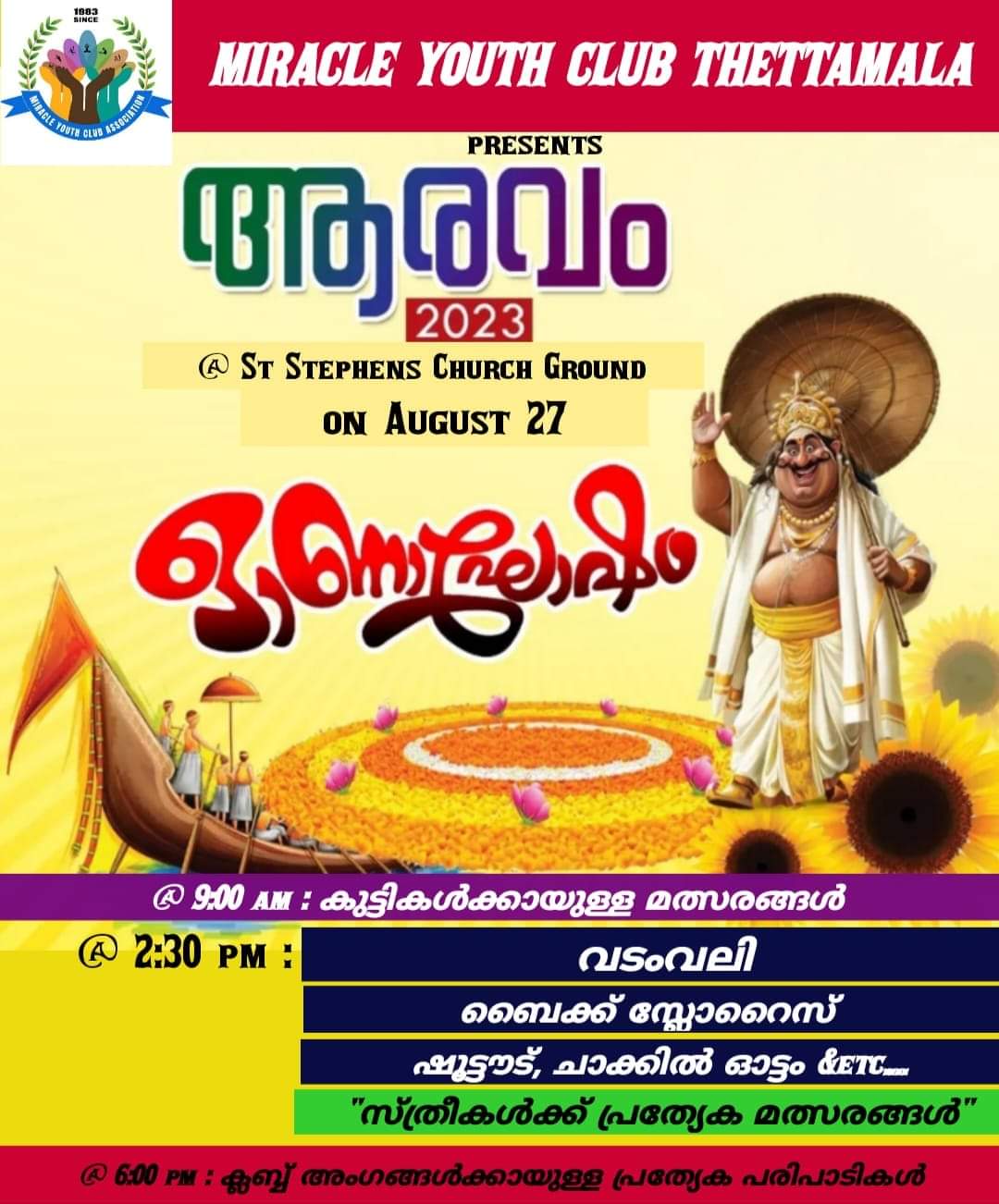 On 27th August 2023 club organised Onam celebration "Aaravam 2023 " at St Stephen's Church ground. Various activities and games have conducted for the children's and women. Various games including tug of war, bike slow race, ball throw, shoot out have been conducted for youth. Club members served Onam Sandhya to all,who have been a part of Miracle Youth Club Association onam celebration.